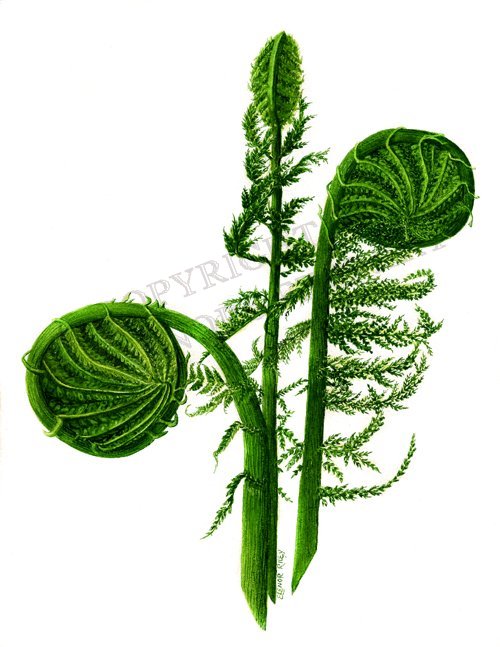 My back yard is an ideal place for ferns so I have an abundant collection that I share with family and friends. The labyrinth within the coils delicately unfolds to a stately feathery backdrop for my flowers. 16 x 19 framed wood