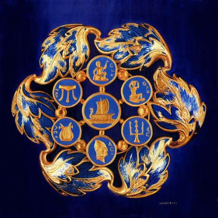 ARTIST STATEMENT A co-worker relayed a tale involving a family heirloom that immediately sparked my interest and once I saw the photos I knew I wanted to paint it. One of the most difficult tasks for me was to render it as close to it’s actual shape as possible (the medallion’s diameter is 2 inches) and since each section is not a perfect replication of its adjacent shape (how boring if it were) many drawings were made before transferring it to canvas. Therefore it is not placed exactly square on the canvas as to show it is perfect in its imperfection. The detail and the workmanship on such a small piece are truly amazing. The worn enamel overlay on the leaves reveals the intricate design, and in some areas you can see beads of gold that were dropped into place and left as is. Thank you Susan for the opportunity to challenge my artistic endeavors in a direction I never anticipated. |
